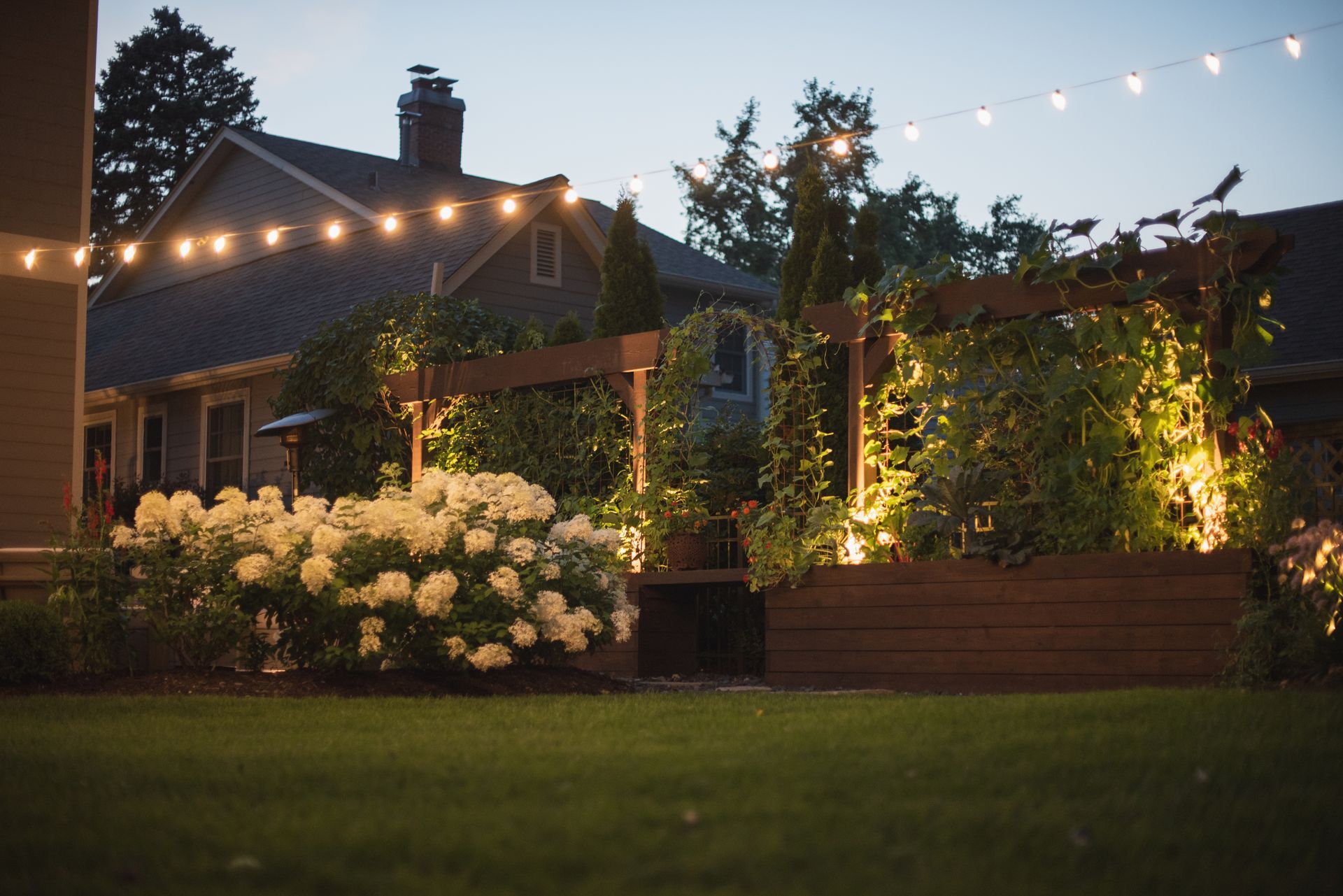 - (2) 12' long linear trellises with custom cut header boards, stained