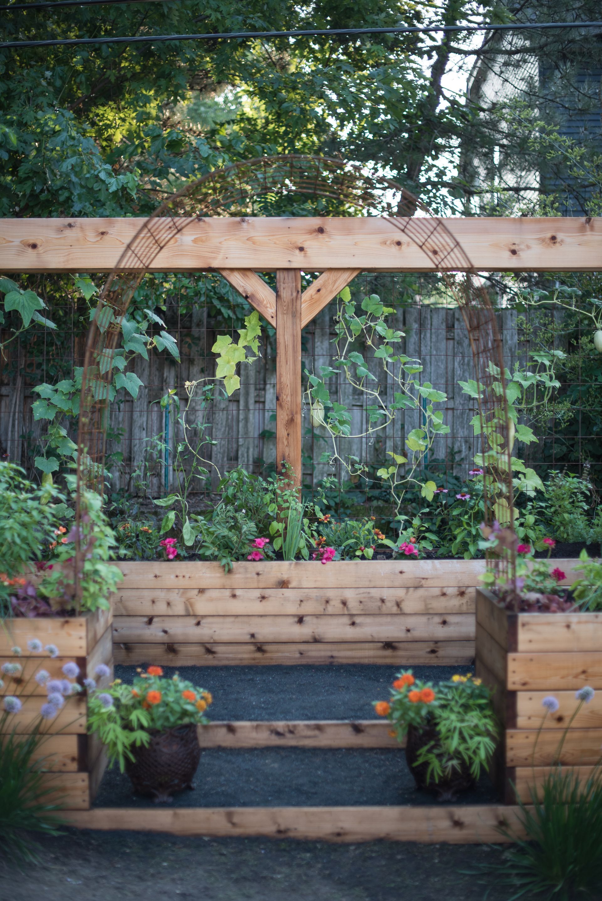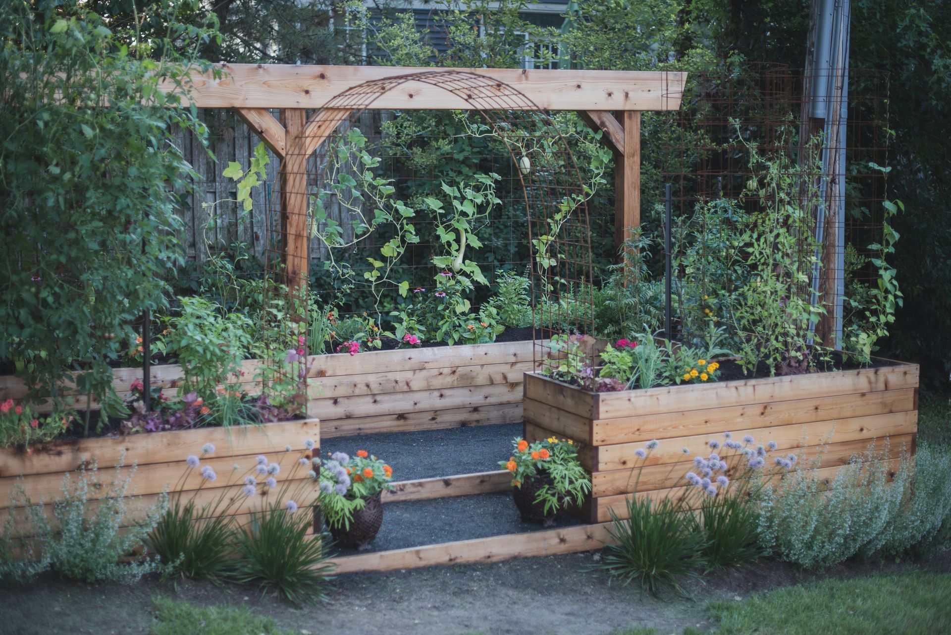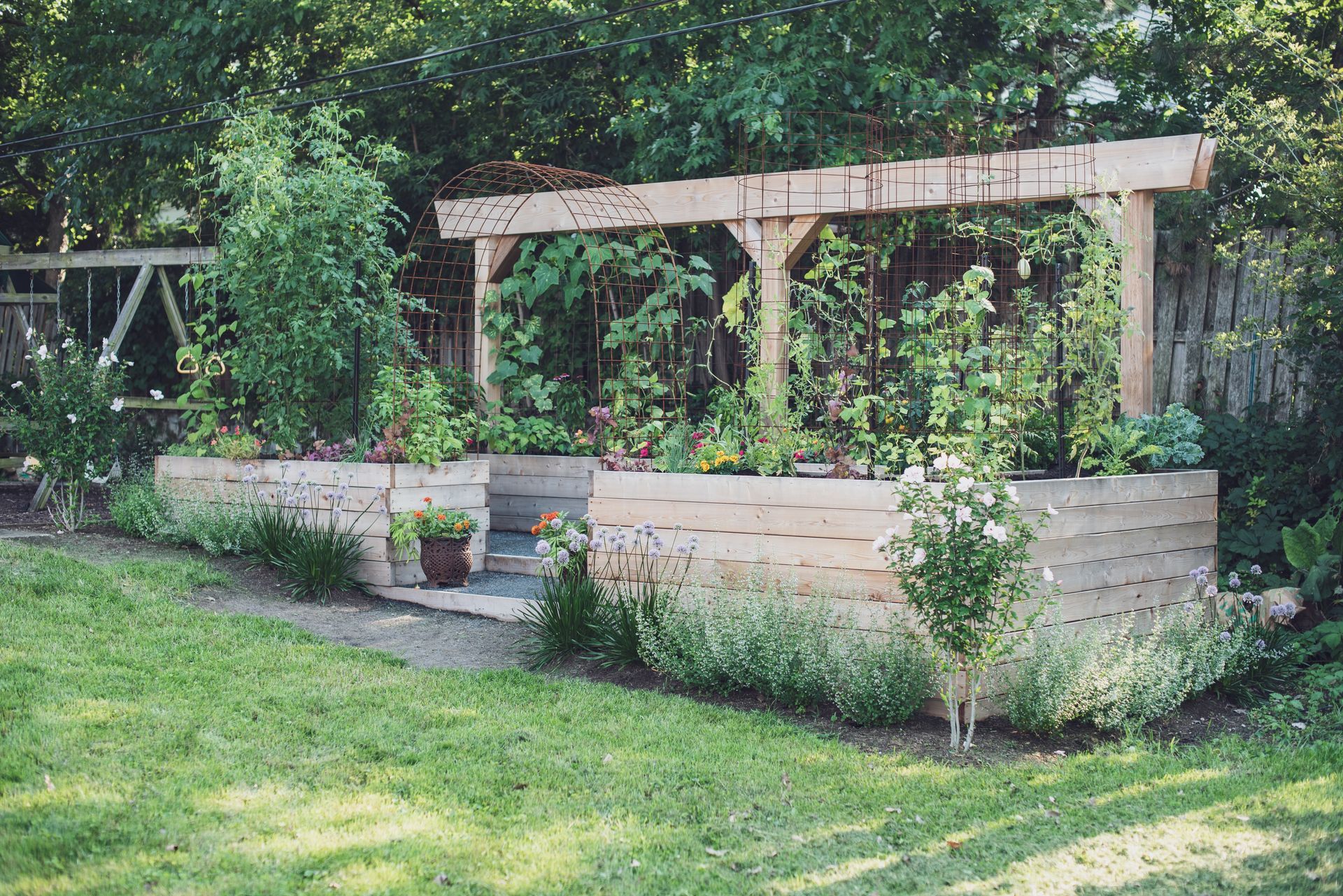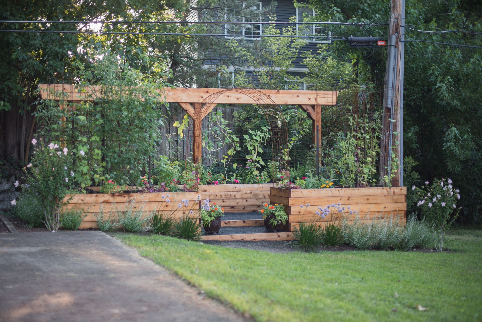 A striking 20-foot trellis anchors the backdrop—adding height, structure, and a dramatic focal point that transforms the entire garden into a vibrant, inviting destination.