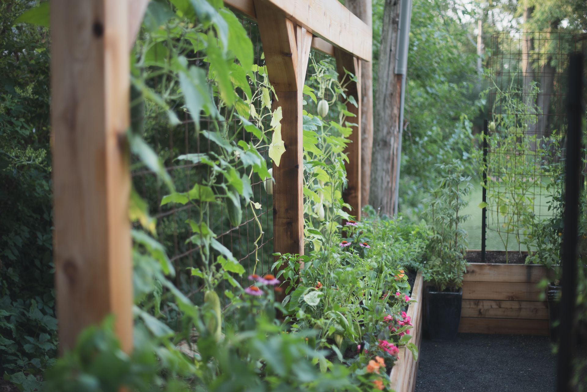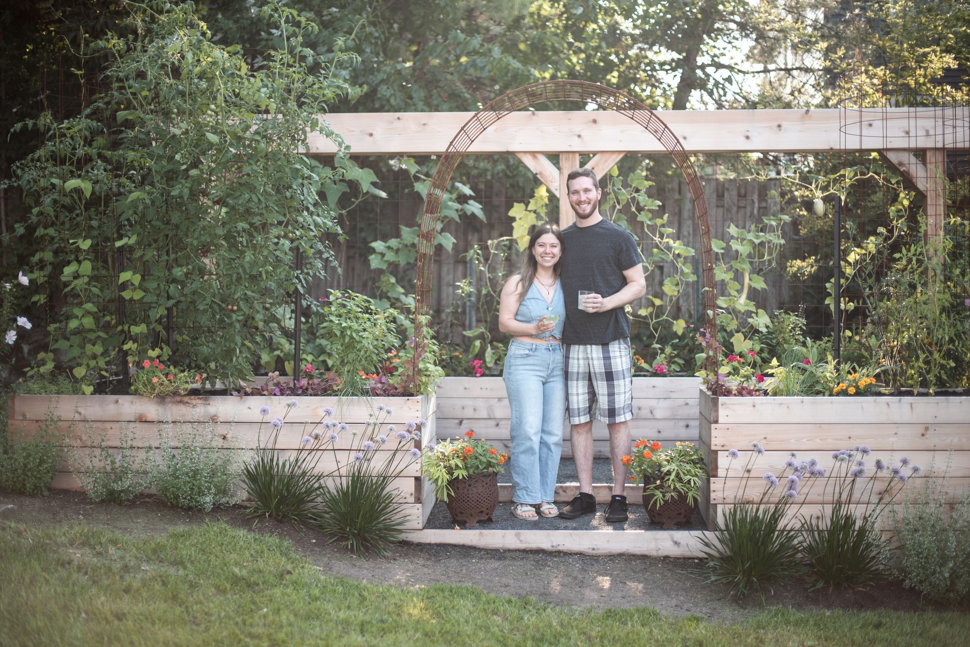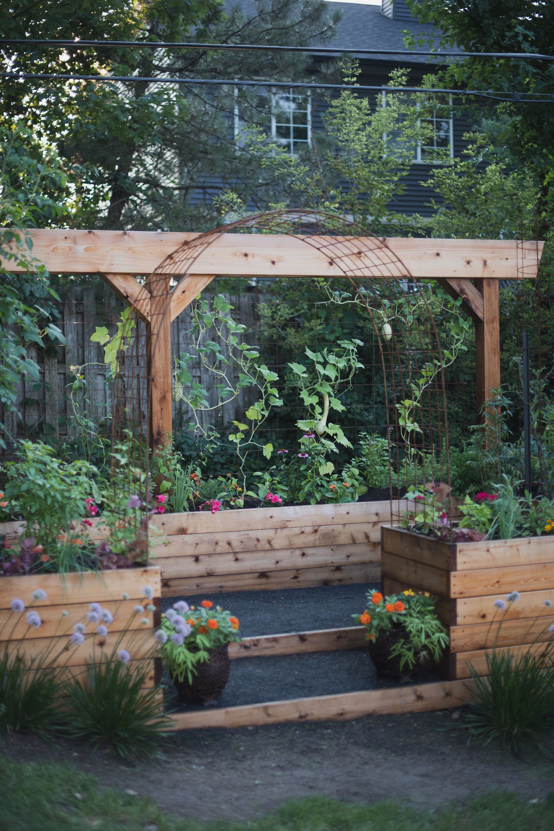 A striking 20-foot trellis anchors the backdrop—adding height, structure, and a dramatic focal point that transforms the entire garden into a vibrant, inviting destination.
