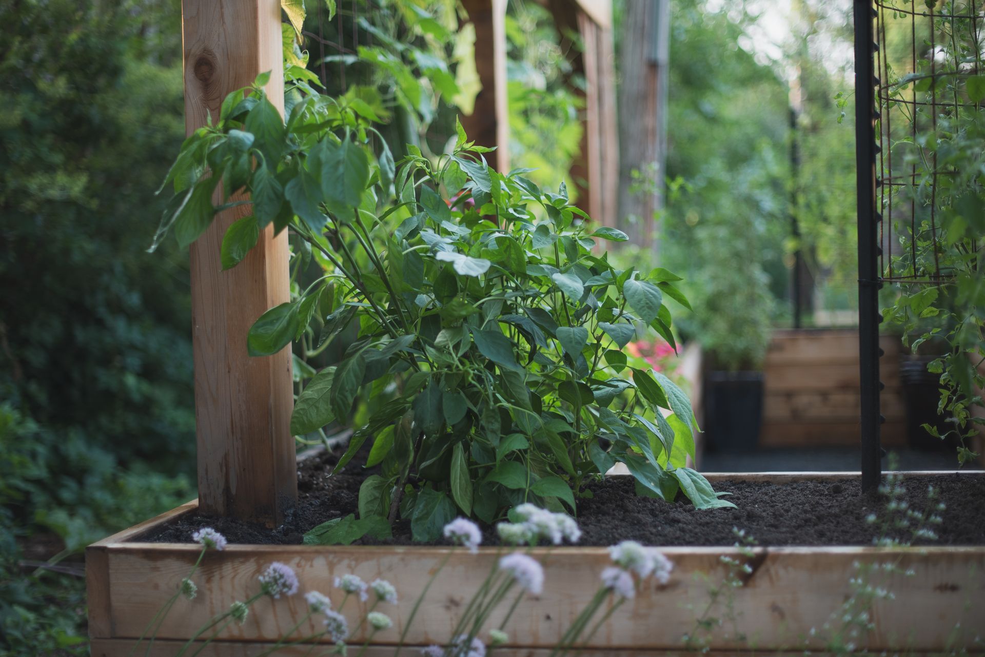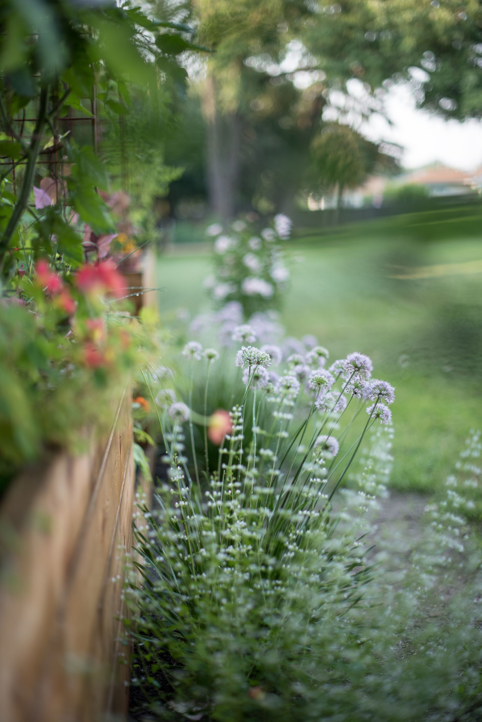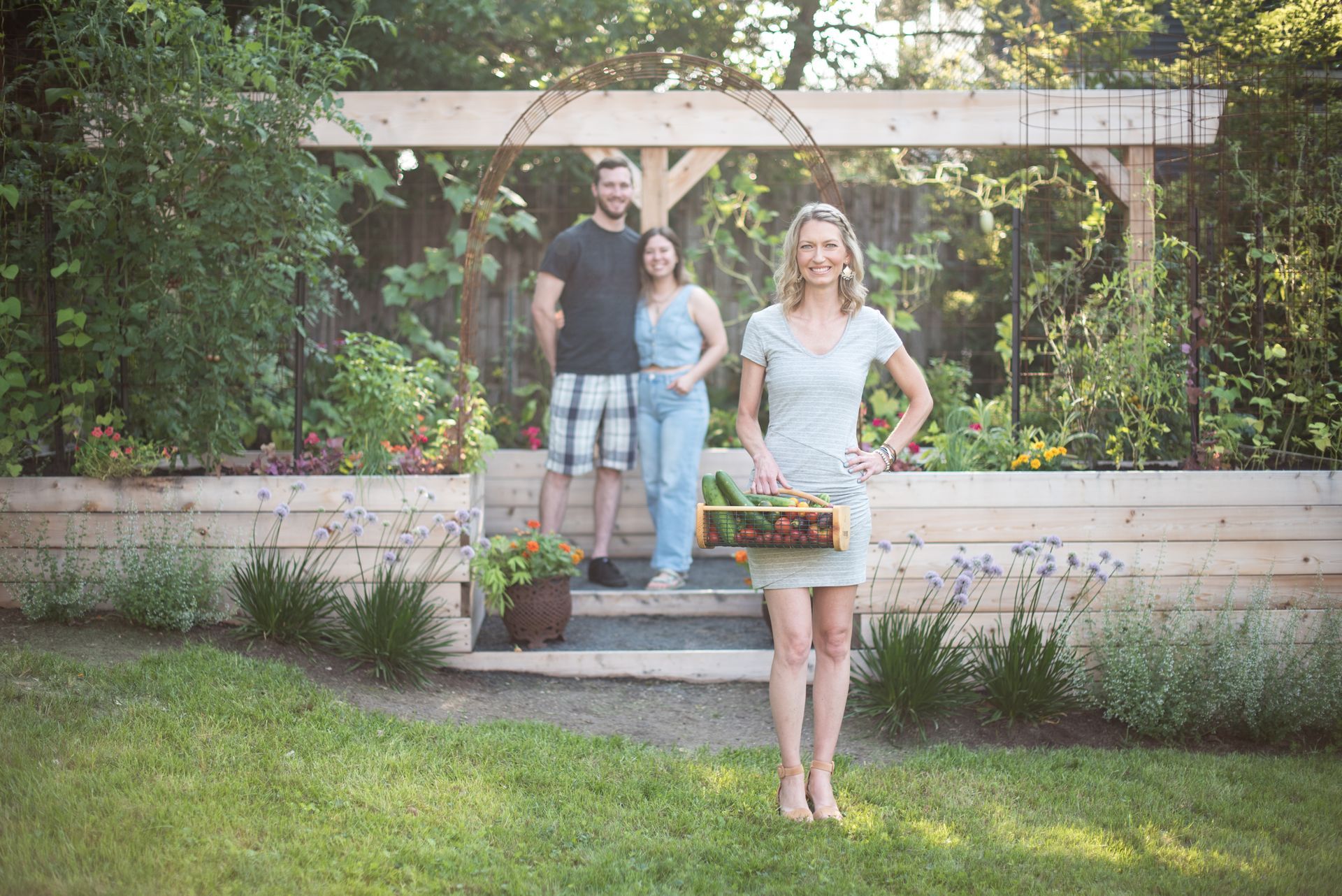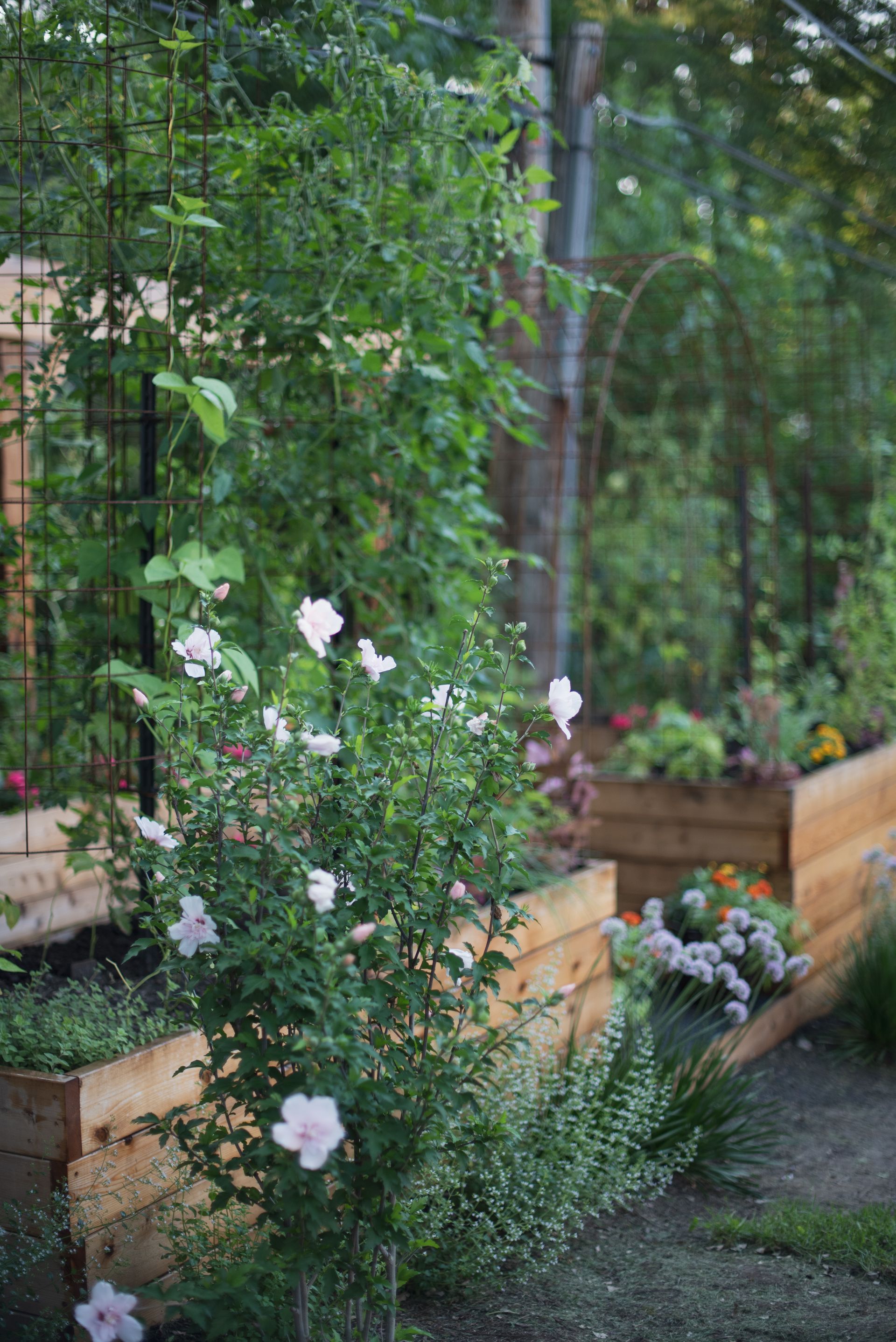 A striking 20-foot trellis anchors the backdrop—adding height, structure, and a dramatic focal point that transforms the entire garden into a vibrant, inviting destination.