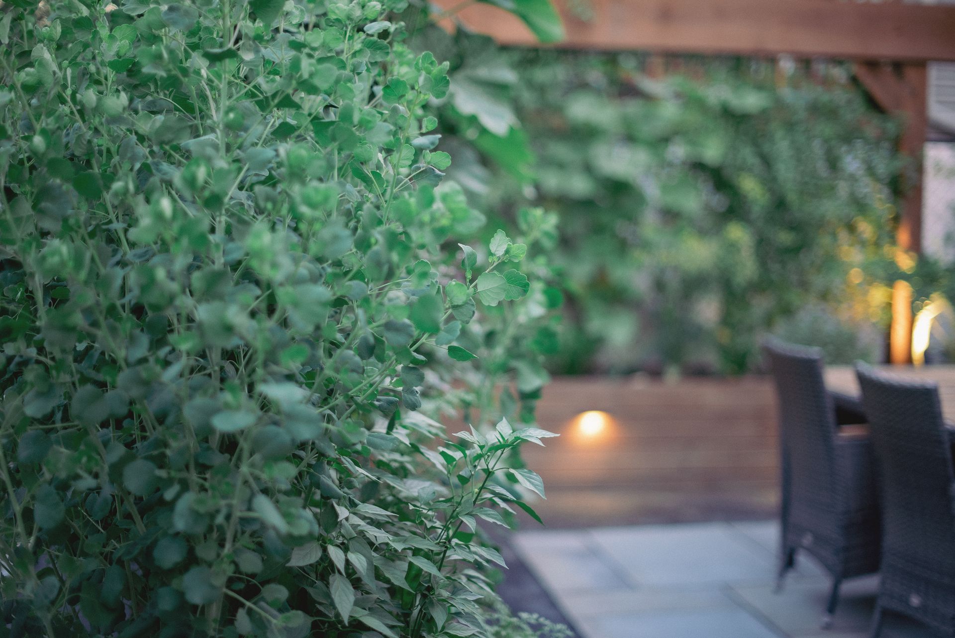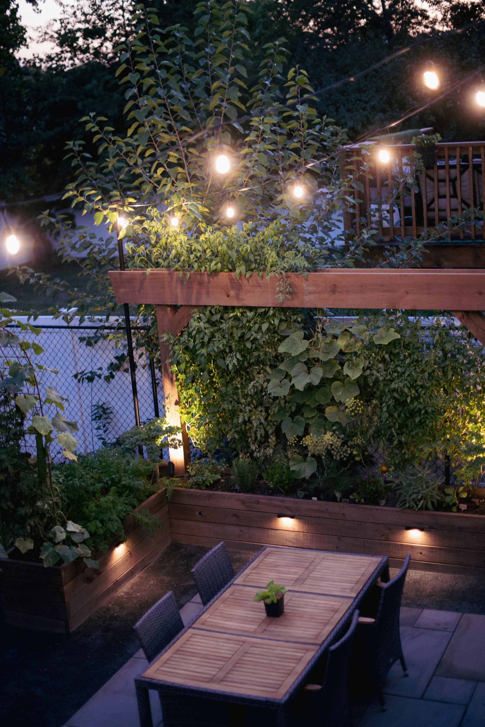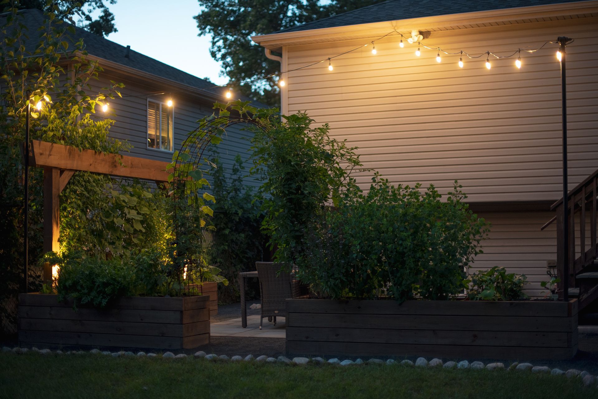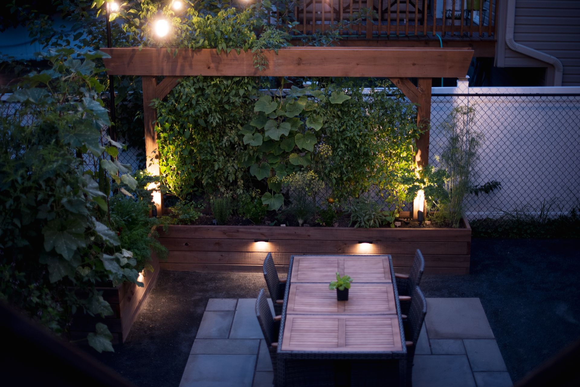 To extend enjoyment well into the evening, we integrated lighting both within the garden boxes and overhead, giving the entire space a warm, inviting glow. What was once an underutilized backyard is now a truly functional outdoor living room.
