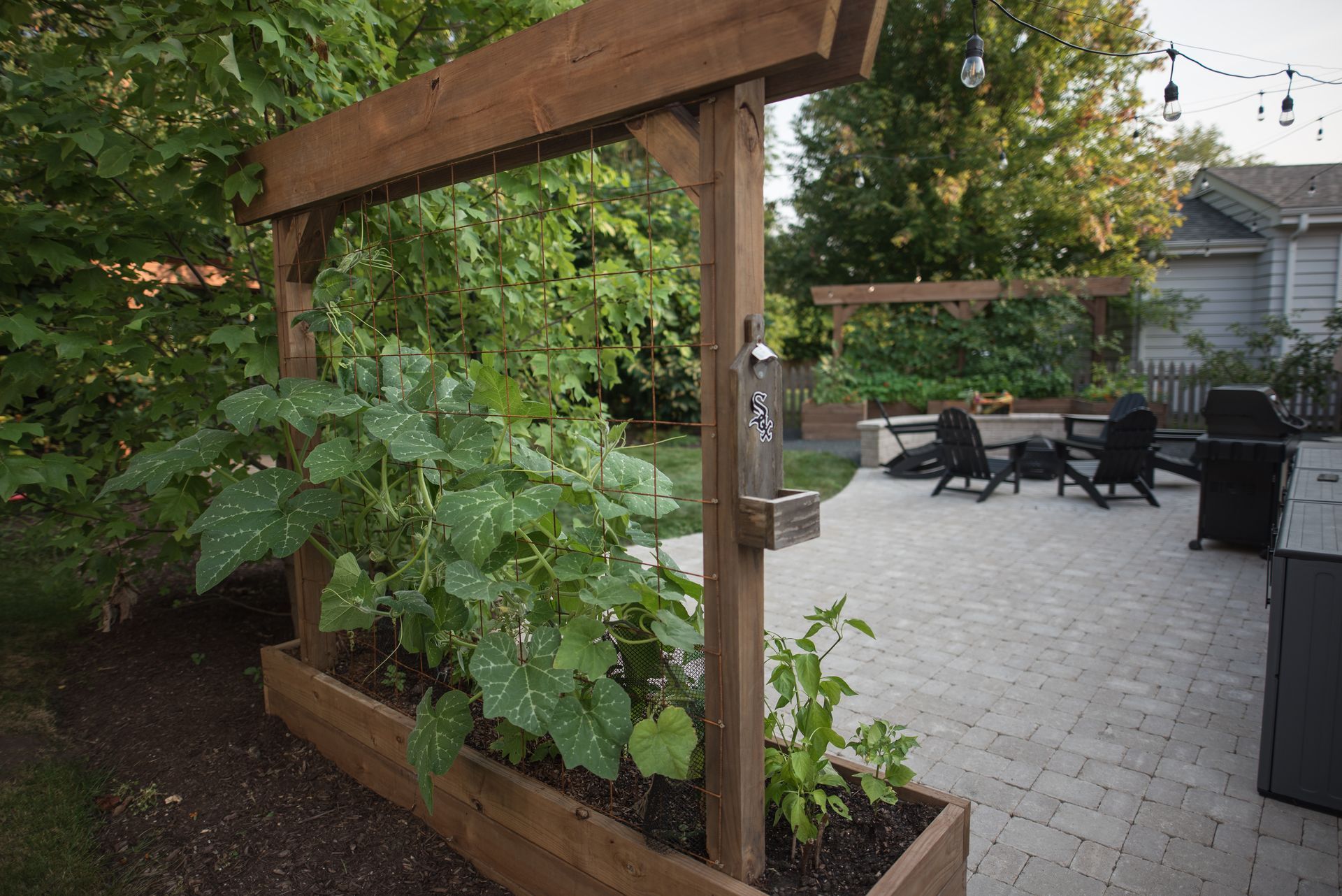 This complete backyard transformation features an expansive and eco-friendly permeable patio with dedicated spaces for outdoor dining, a firepit, and a lounge area. The focal point E-shaped box with a linear trellis provides ample grow space and privacy for nights by the fire with family and friends.