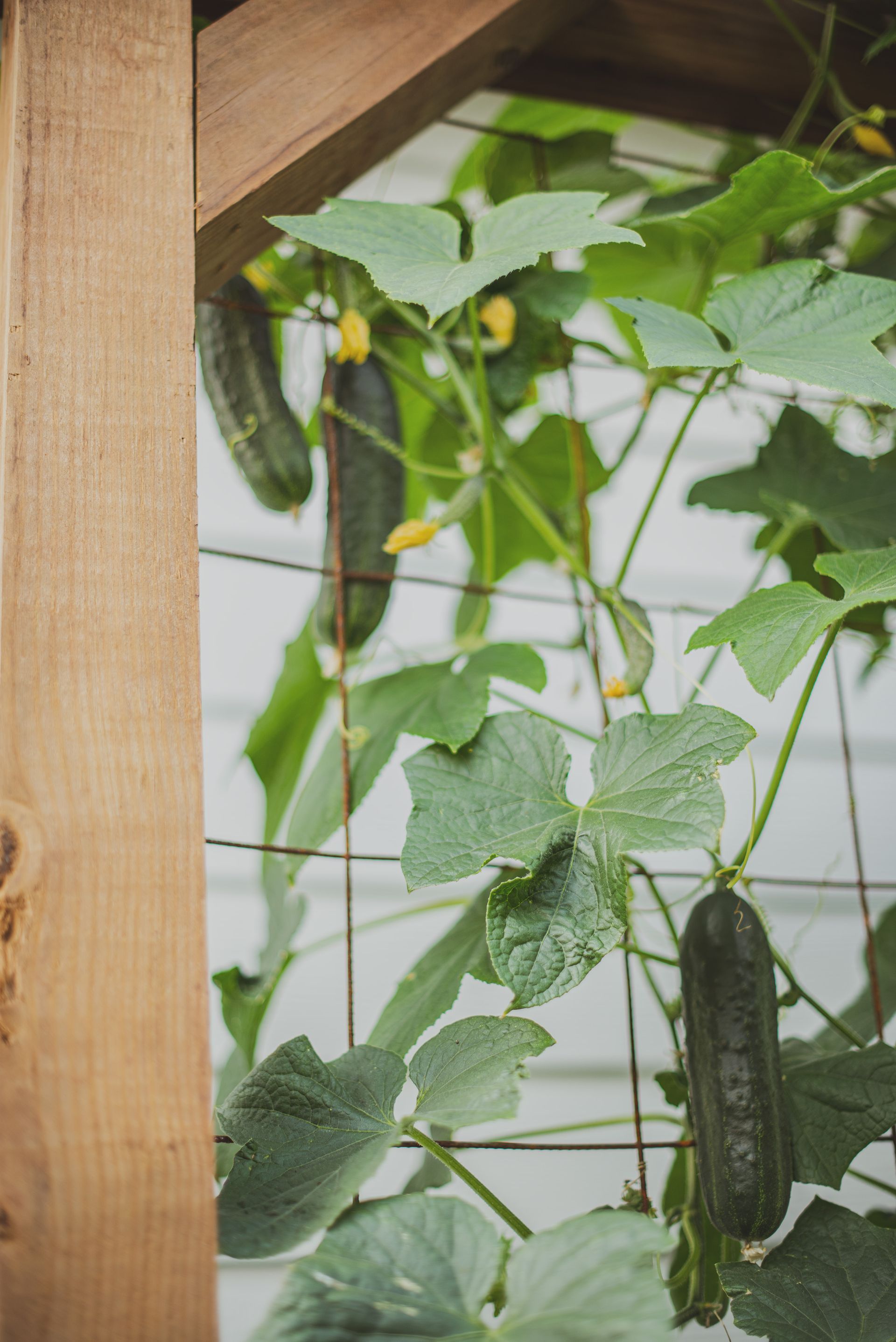 It's amazing how much produce you can grow in a slim box alongside a building! This simple and beautiful garden showcases a long functional trellis creating a lush backdrop supporting plenty of vertical growth.