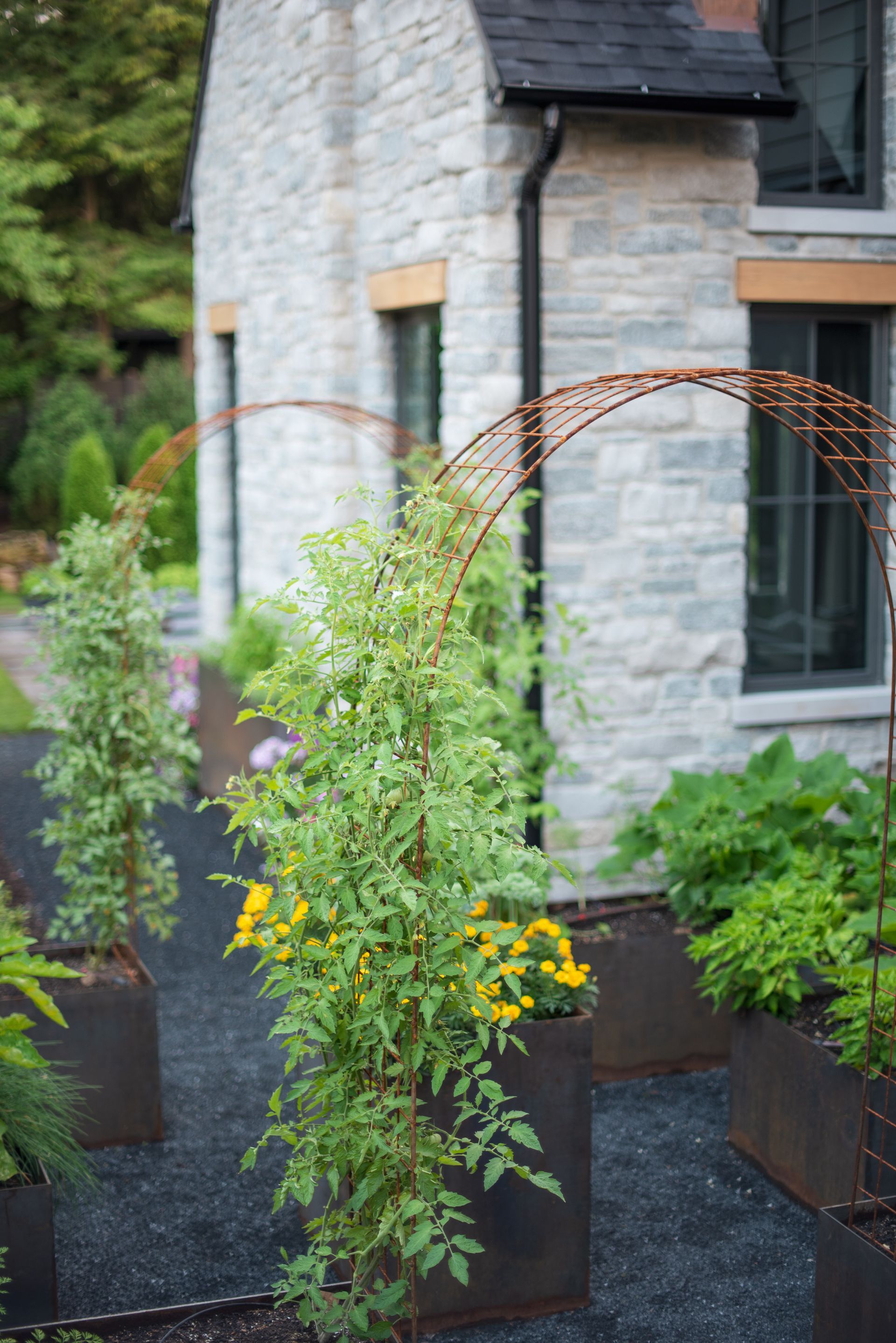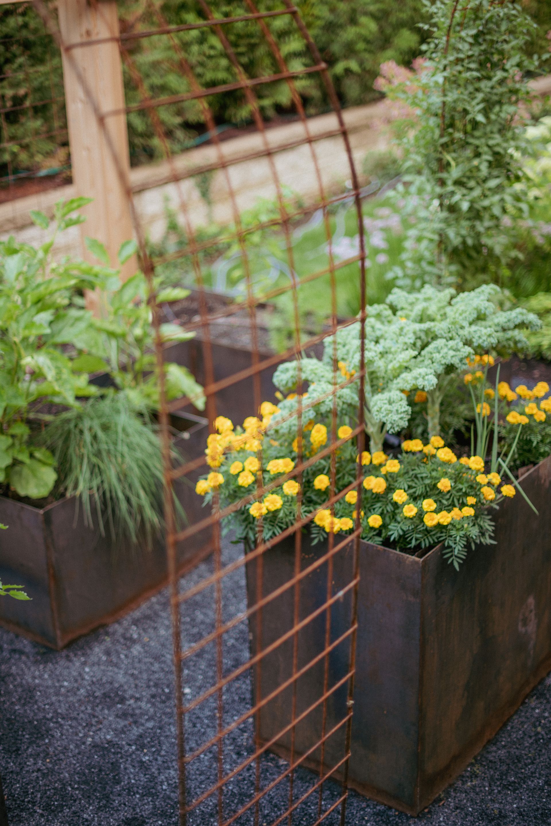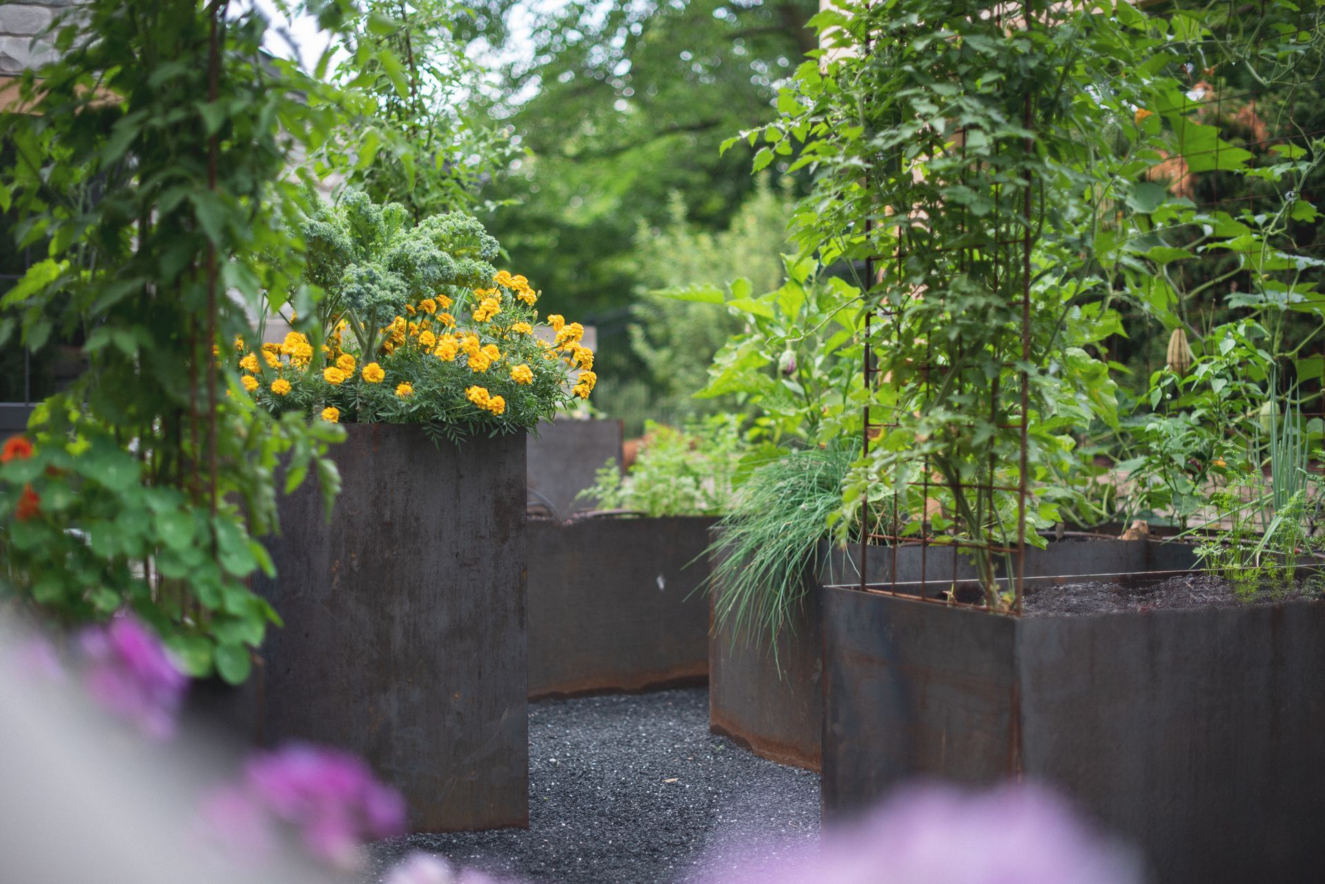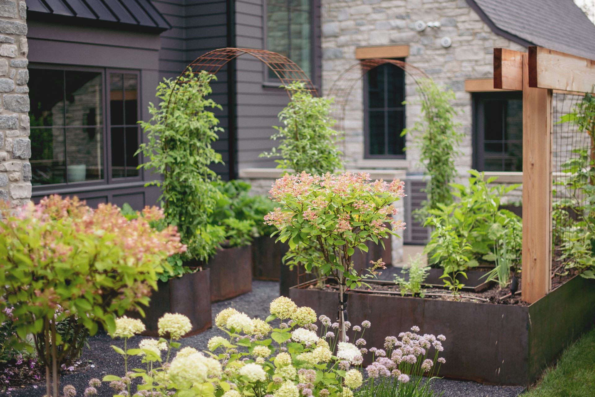 The homeowners—both professional chefs—built a new home and dreamed of a functional garden where they could grow fresh ingredients for their culinary creations. The builders had installed three basic garden beds, but they were too close together, too low to the ground, and offered no vertical growing space for vining plants. So, we started from scratch and installed a stunning steel garden that maximizes every inch of space, adds much-needed height and structure, and seamlessly flows into the rest of their outdoor living areas. The result is a highly productive, visually-striking designer garden that truly supports the way they cook and live!