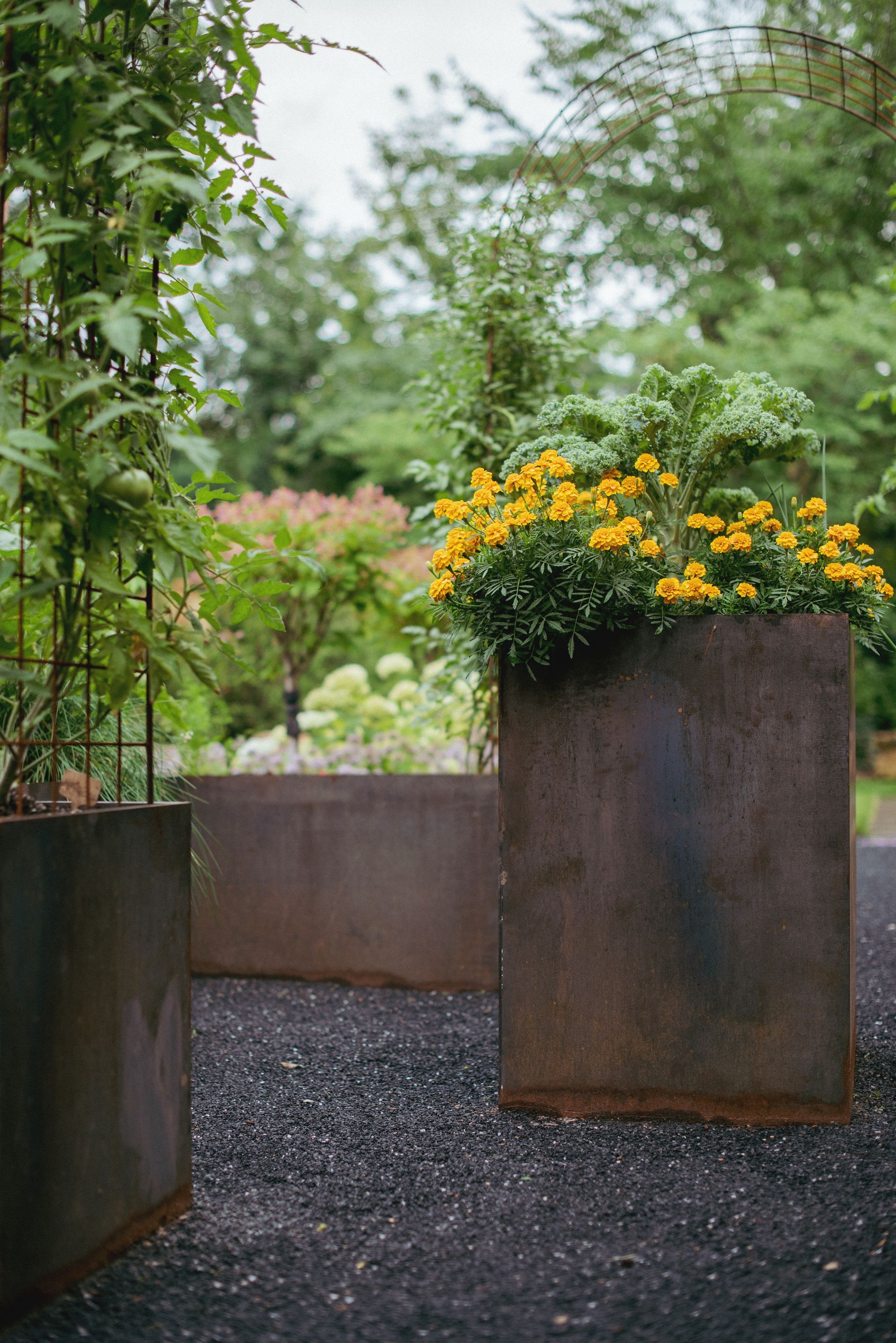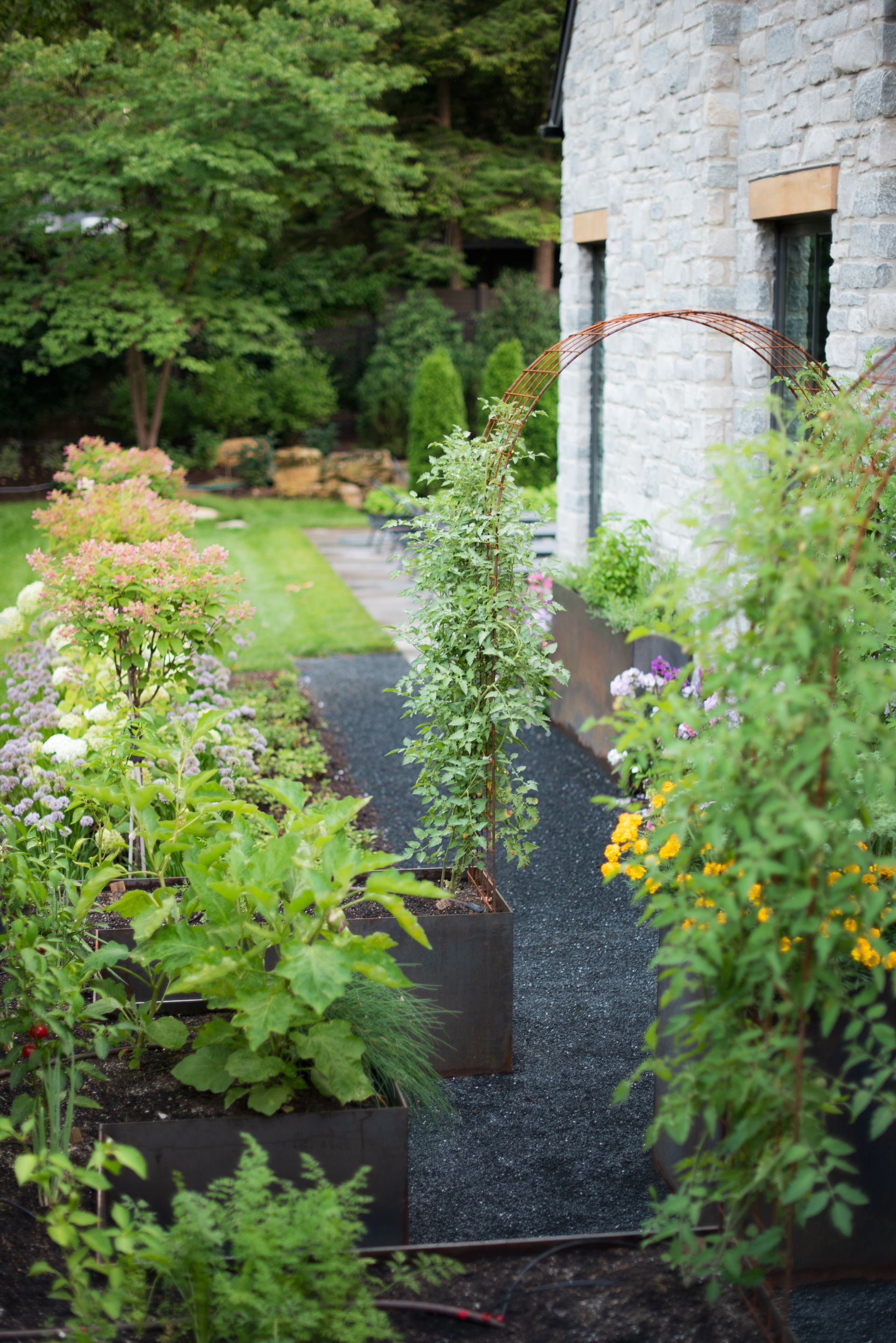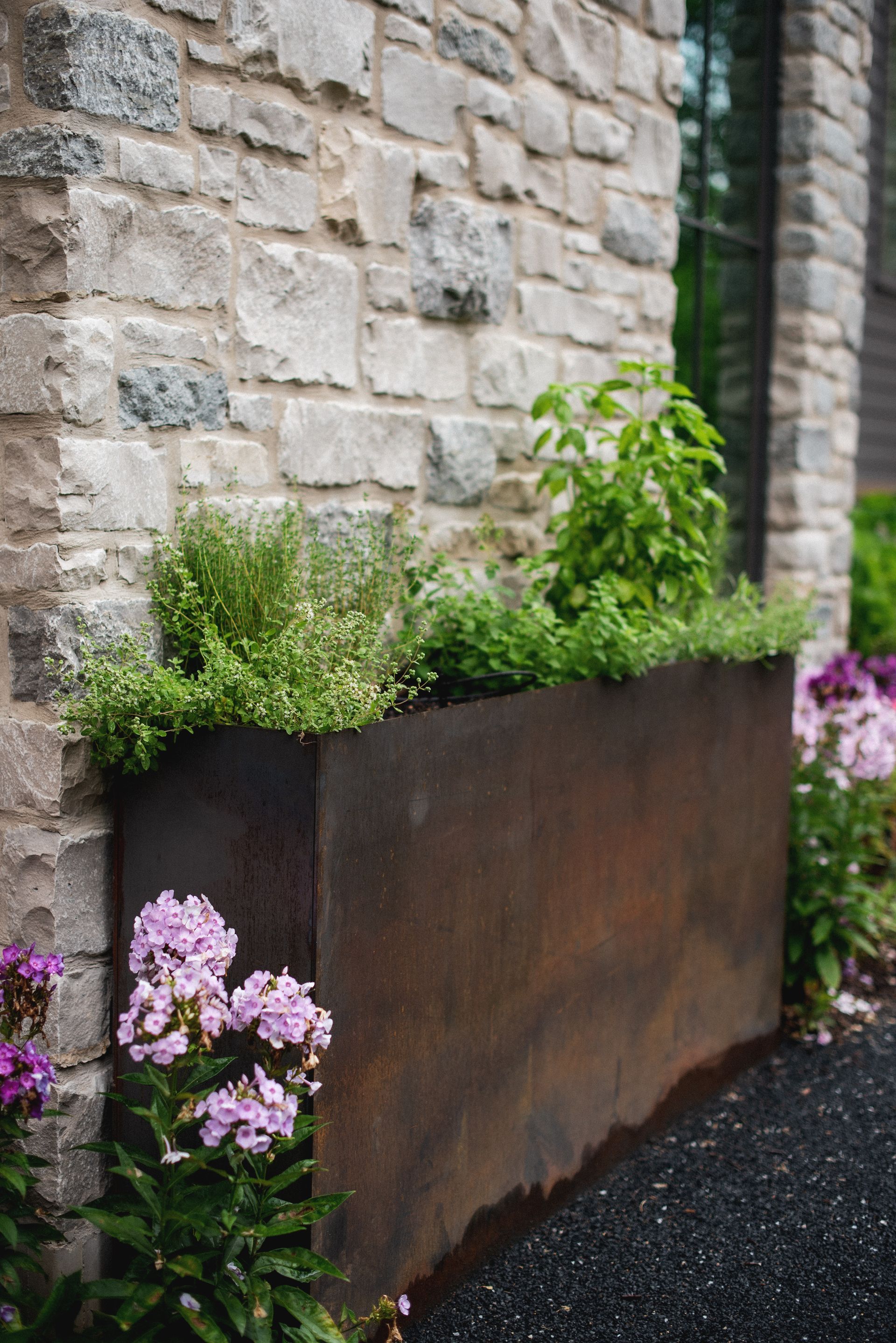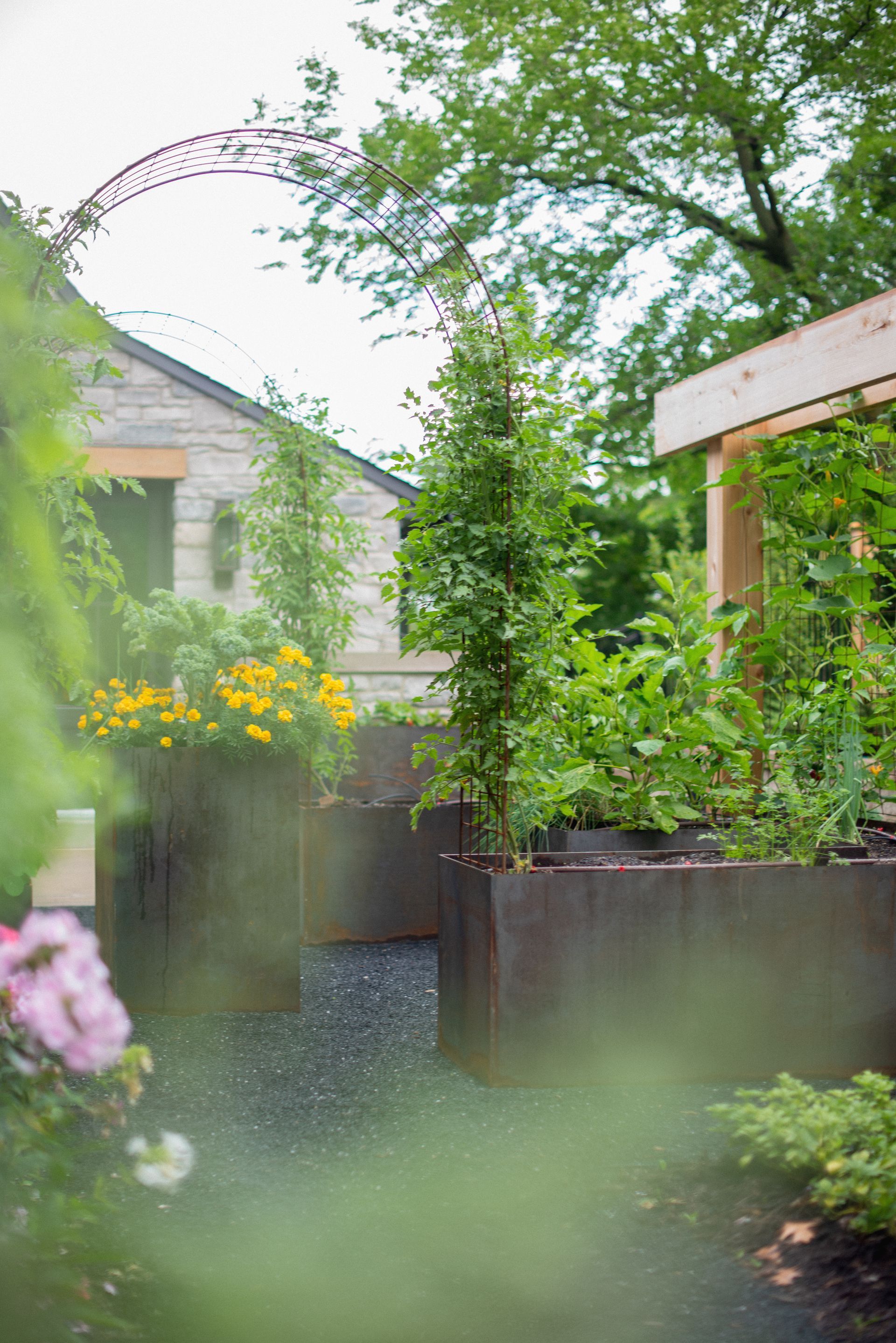 The homeowners—both professional chefs—built a new home and dreamed of a functional garden where they could grow fresh ingredients for their culinary creations. The builders had installed three basic garden beds, but they were too close together, too low to the ground, and offered no vertical growing space for vining plants. So, we started from scratch and installed a stunning steel garden that maximizes every inch of space, adds much-needed height and structure, and seamlessly flows into the rest of their outdoor living areas. The result is a highly productive, visually-striking designer garden that truly supports the way they cook and live!
