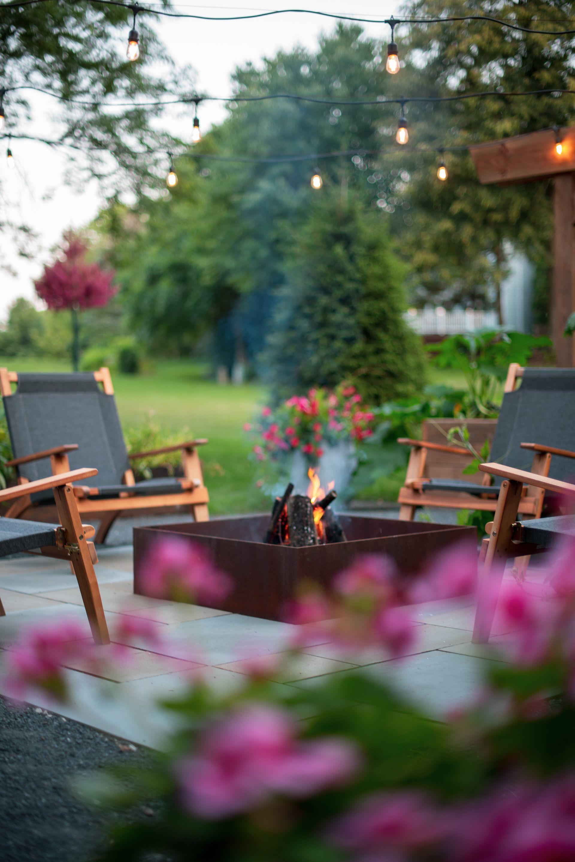 Gardens and fire pits are the perfect combo. The owners wanted to convert an unused corner of their lawn into a cozy space to work and relax in. This beautiful garden is centered around a Corten steel fire pit set in a bluestone patio surrounded by decomposed granite. We mixed elements of steel and wood with Edison bulb lights strung above to tie it all together. The trellis and tomato cages are multi-functional as they support vertical growth and create privacy while you kick back by the fire.