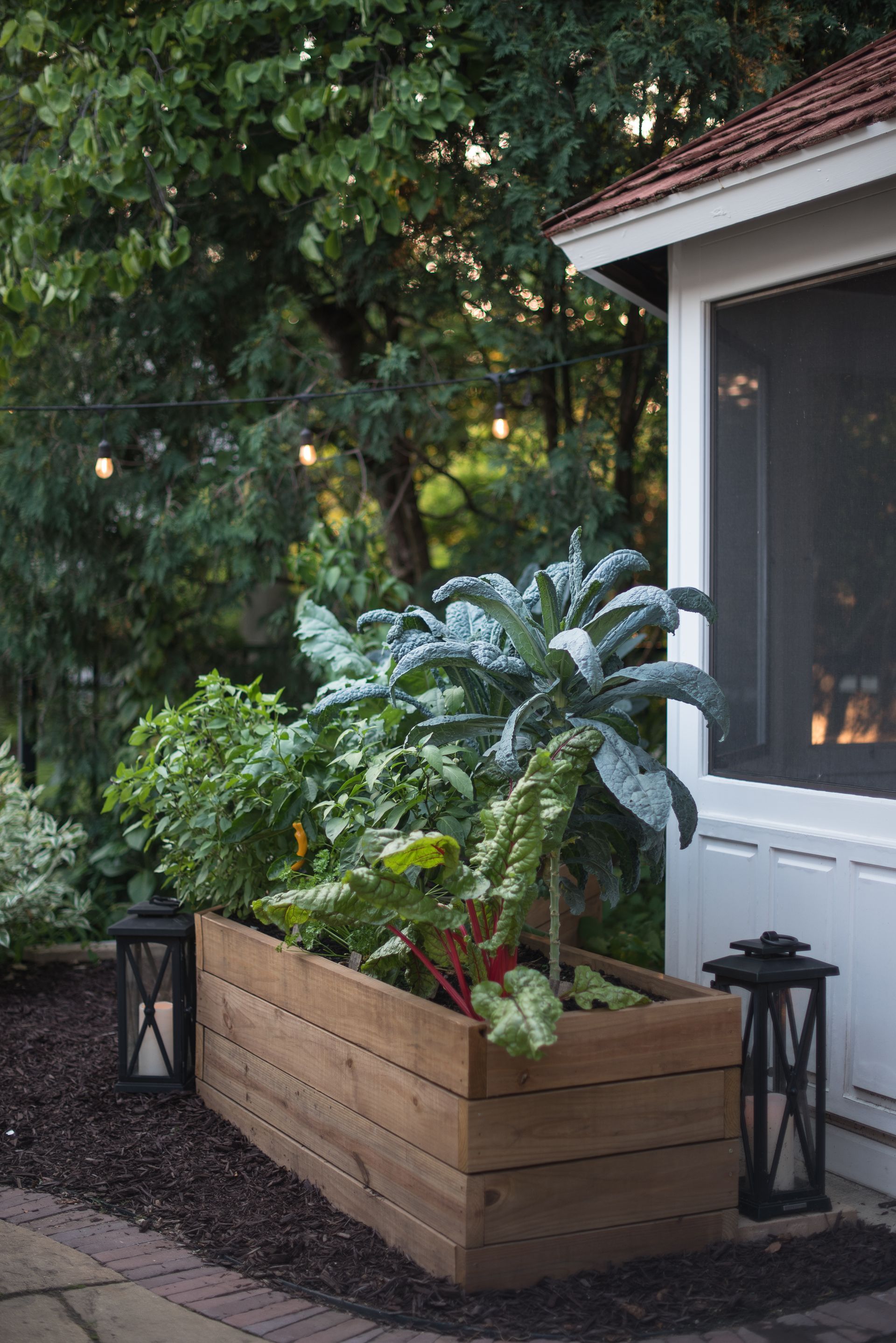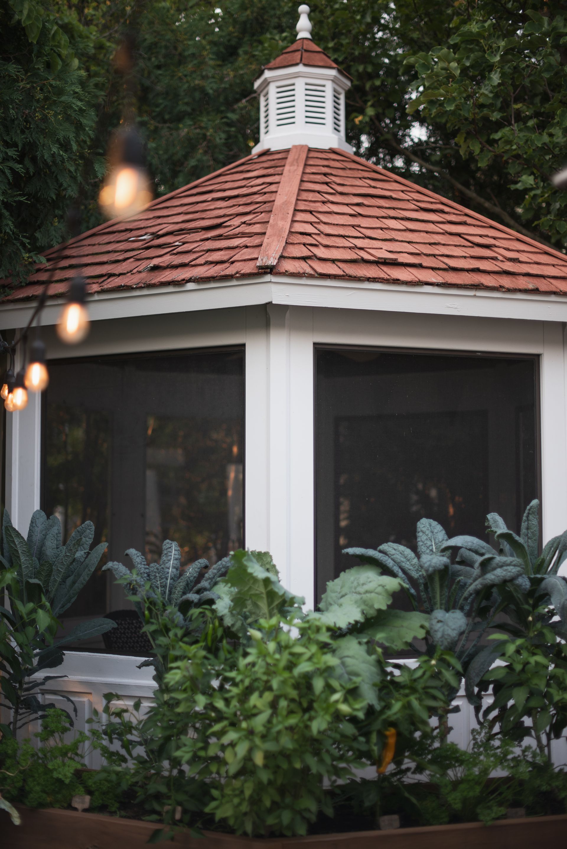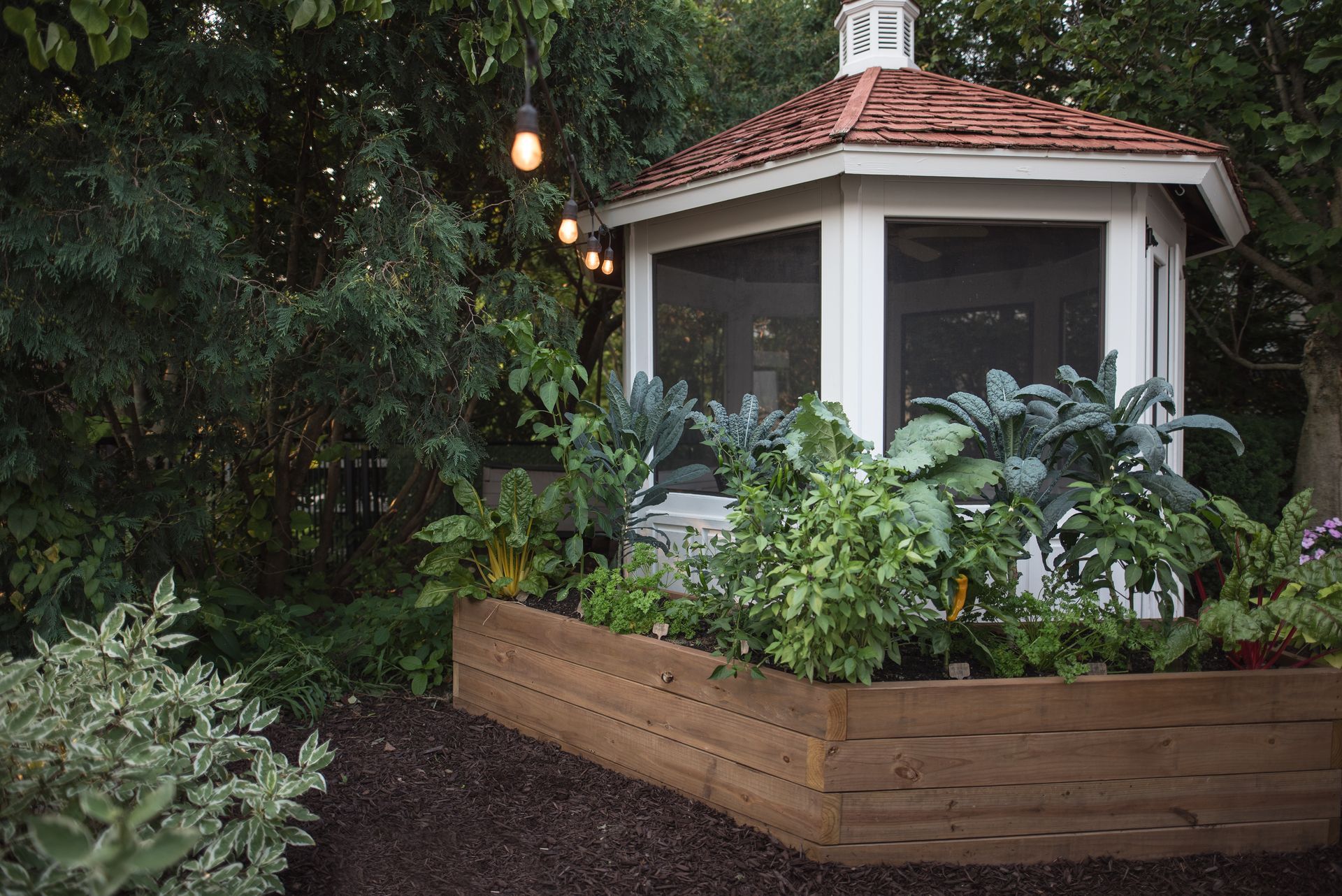 This is the perfect kitchen garden full of peppers, greens and herbs! To enhance the beautiful gazebo, we went with custom angles for a wrap-around garden box.