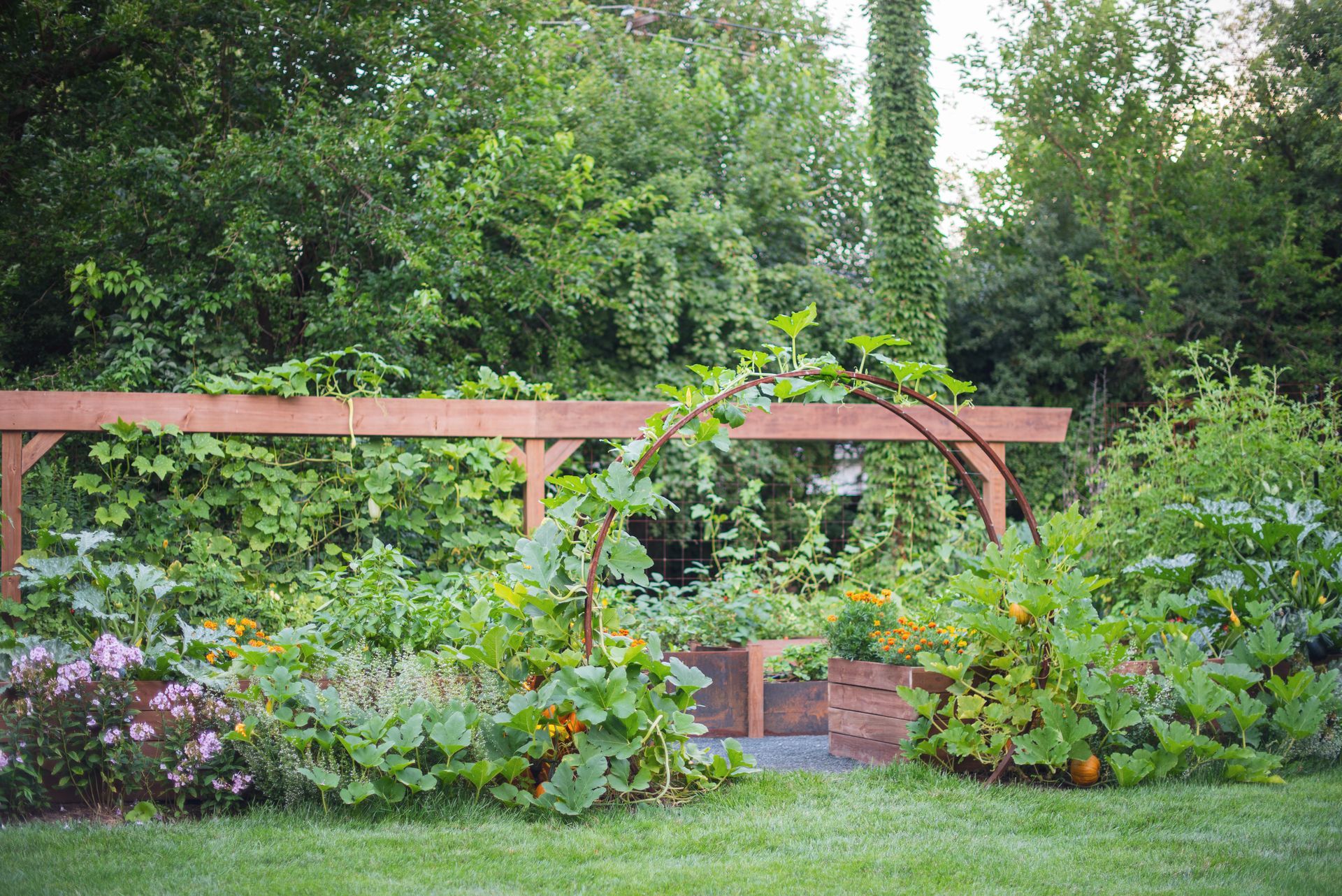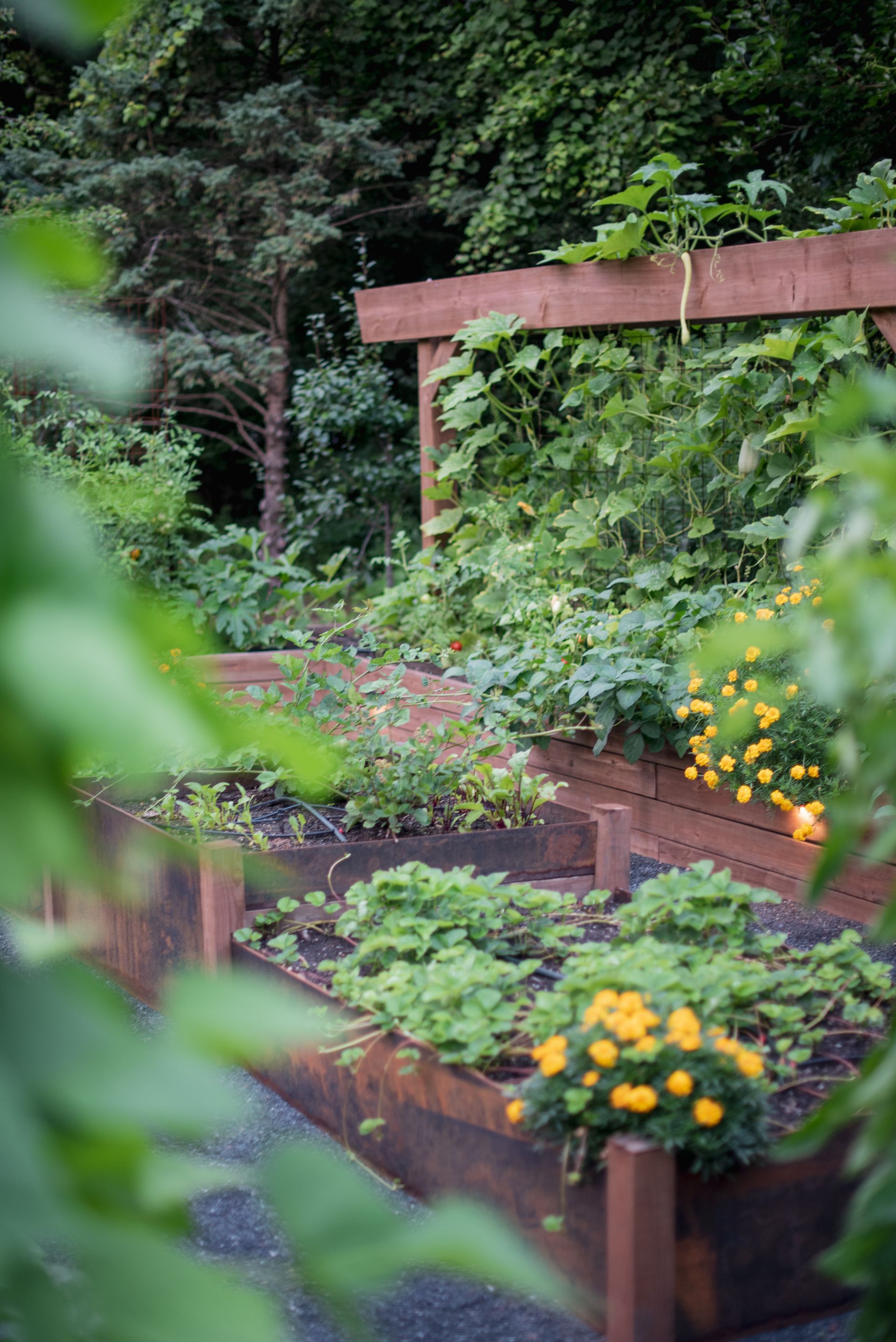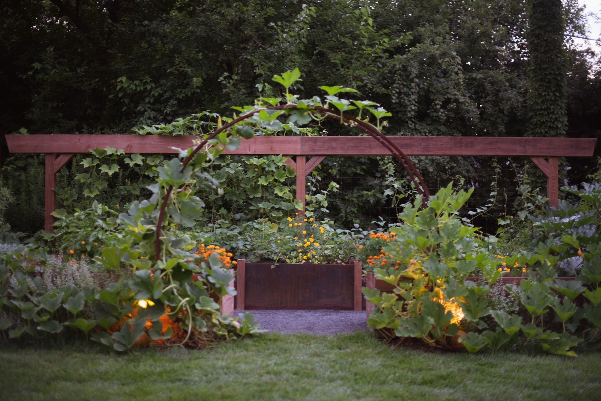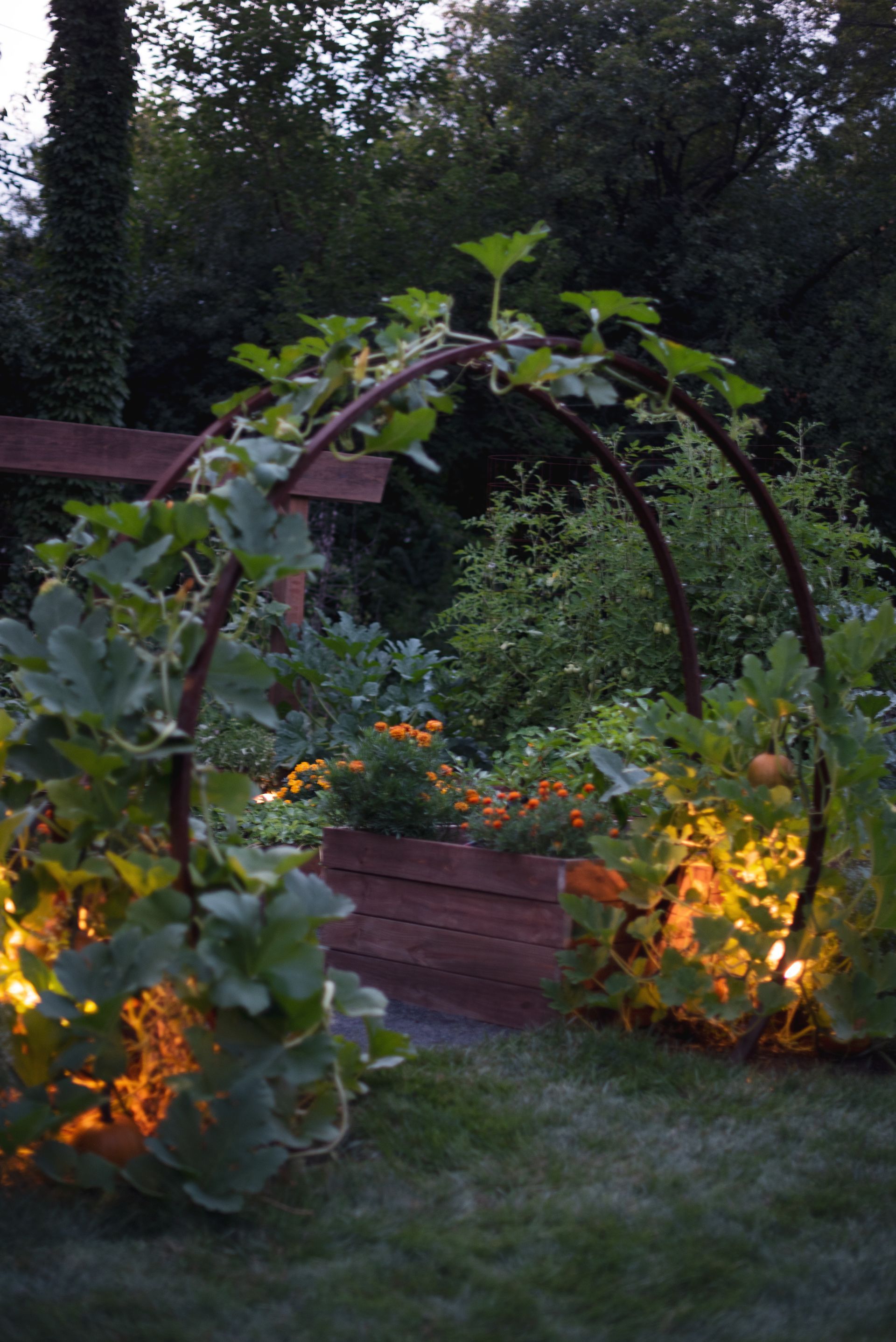 This property features two distinct garden spaces: a smaller kitchen garden designed for herbs and berries centered around a charming fountain, and a larger garden built to support massive vining plants that need room to roam. The larger space—known as the Moongate Garden—gets its name from the arched entryway where pumpkins are grown to cascade over the top. Inside, the decomposed granite path loops around a central steel, stair-stepped planter filled with strawberries, all set agaist the backdrop of a striking 34-foot linear trellis. Together, these gardens create a beautiful, productive landscape that's both functional and full of character!