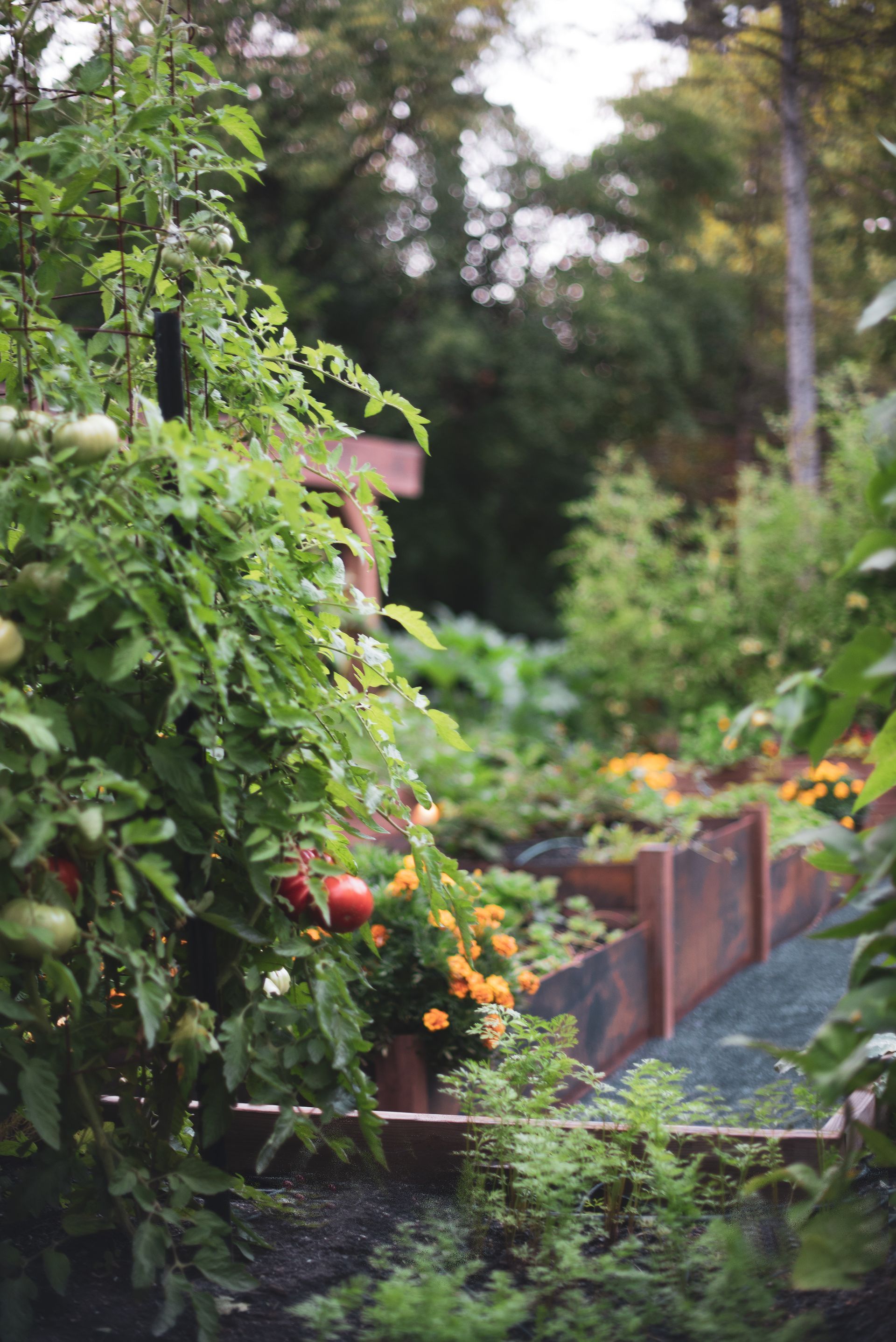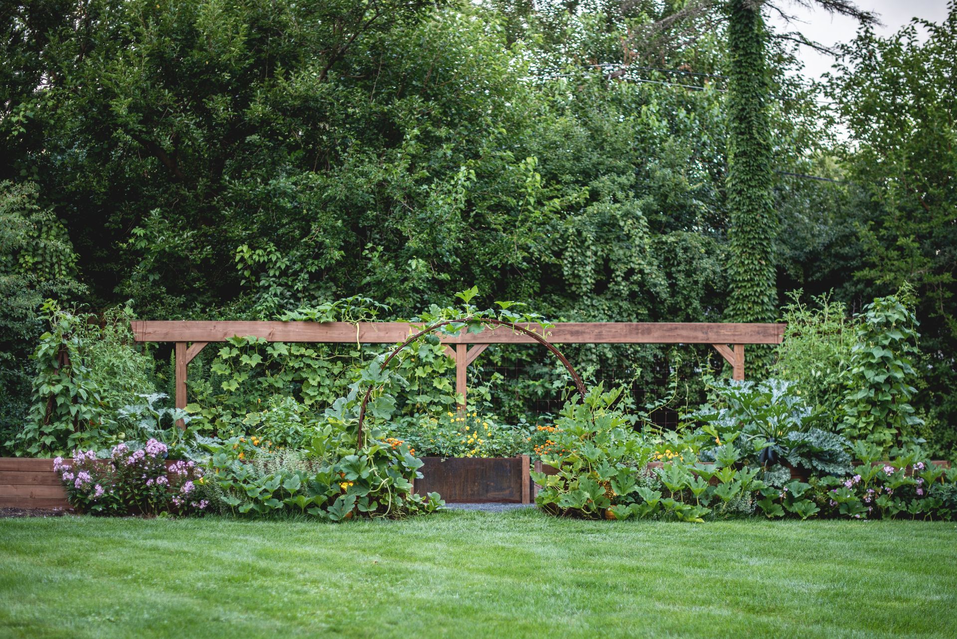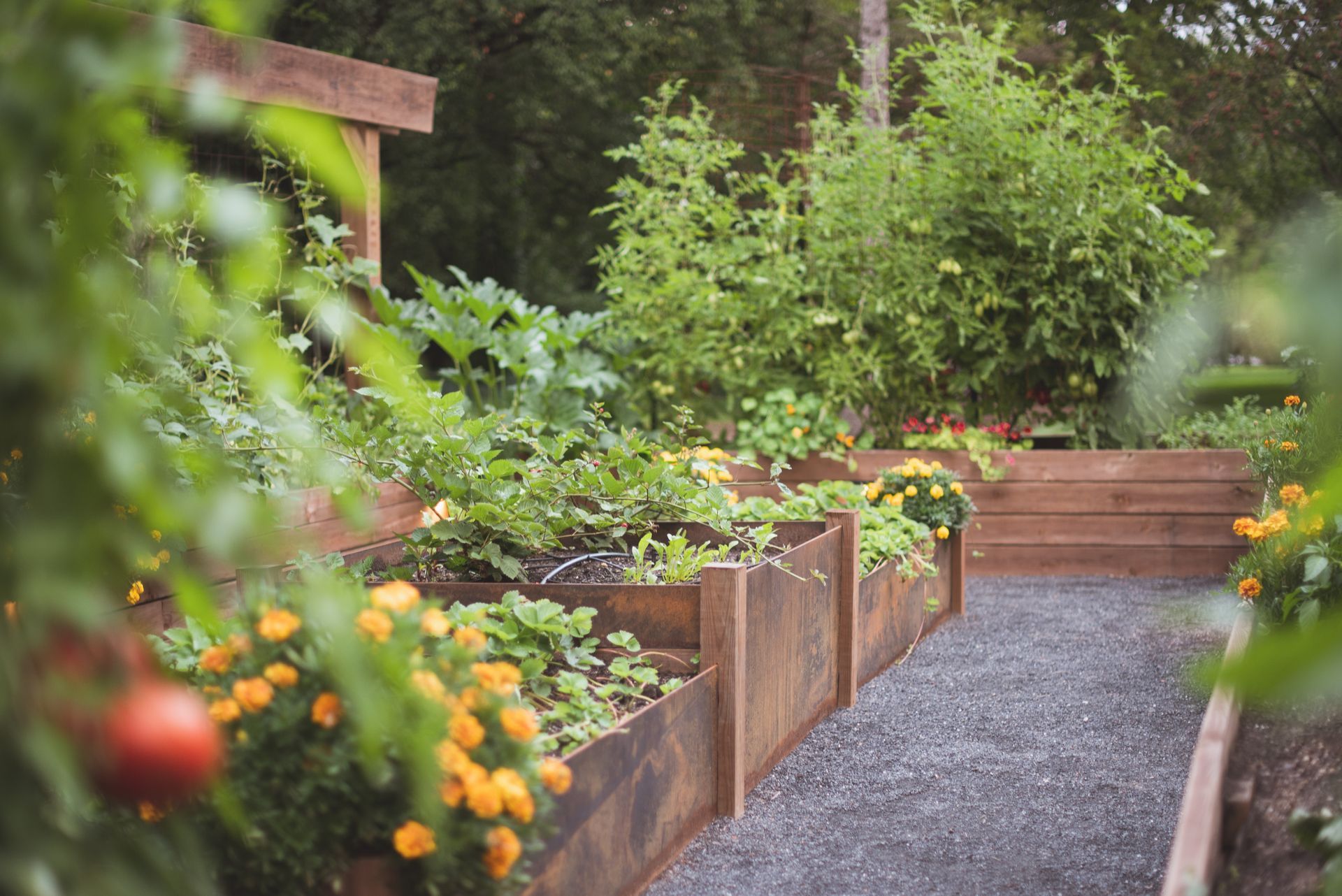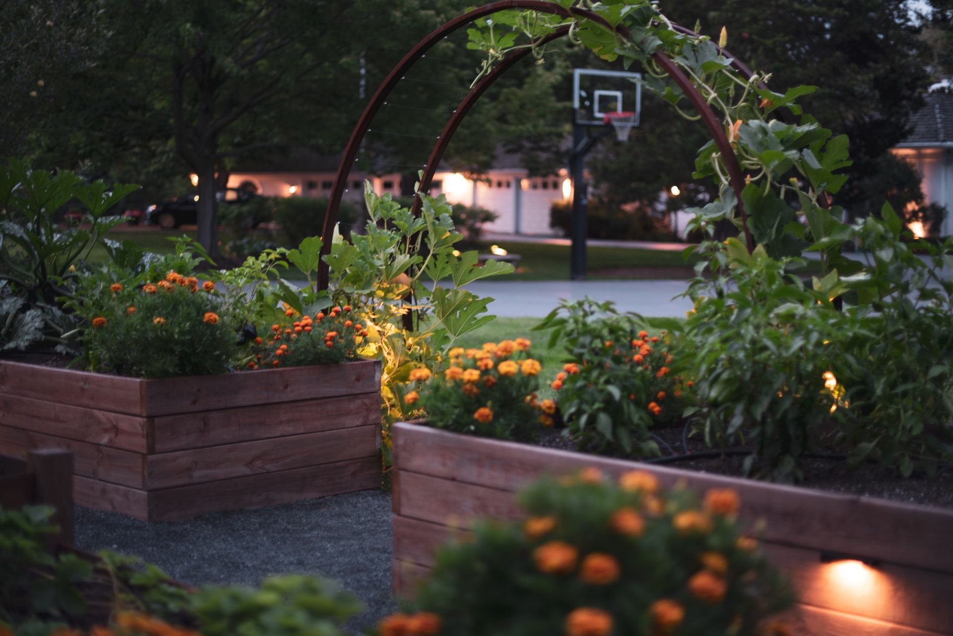 This property features two distinct garden spaces: a smaller kitchen garden designed for herbs and berries centered around a charming fountain, and a larger garden built to support massive vining plants that need room to roam. The larger space—known as the Moongate Garden—gets its name from the arched entryway where pumpkins are grown to cascade over the top. Inside, the decomposed granite path loops around a central steel, stair-stepped planter filled with strawberries, all set agaist the backdrop of a striking 34-foot linear trellis. Together, these gardens create a beautiful, productive landscape that's both functional and full of character!