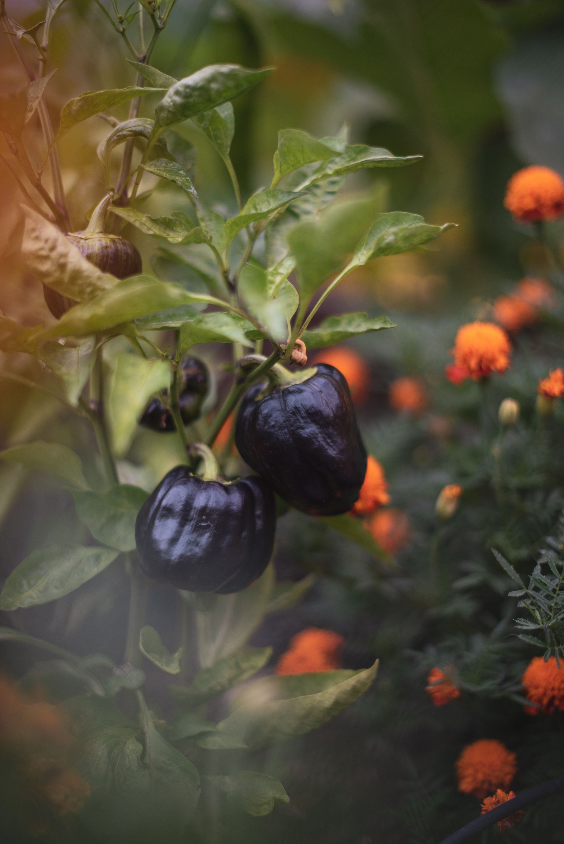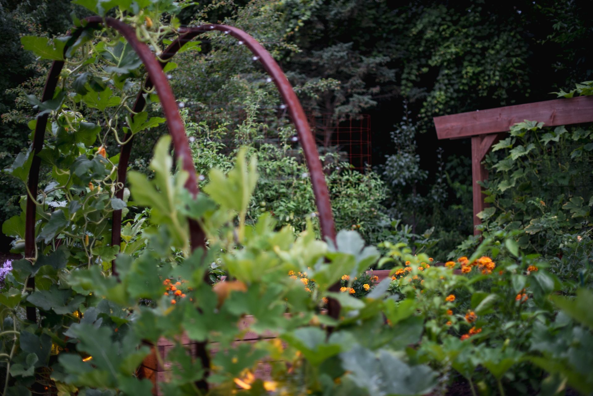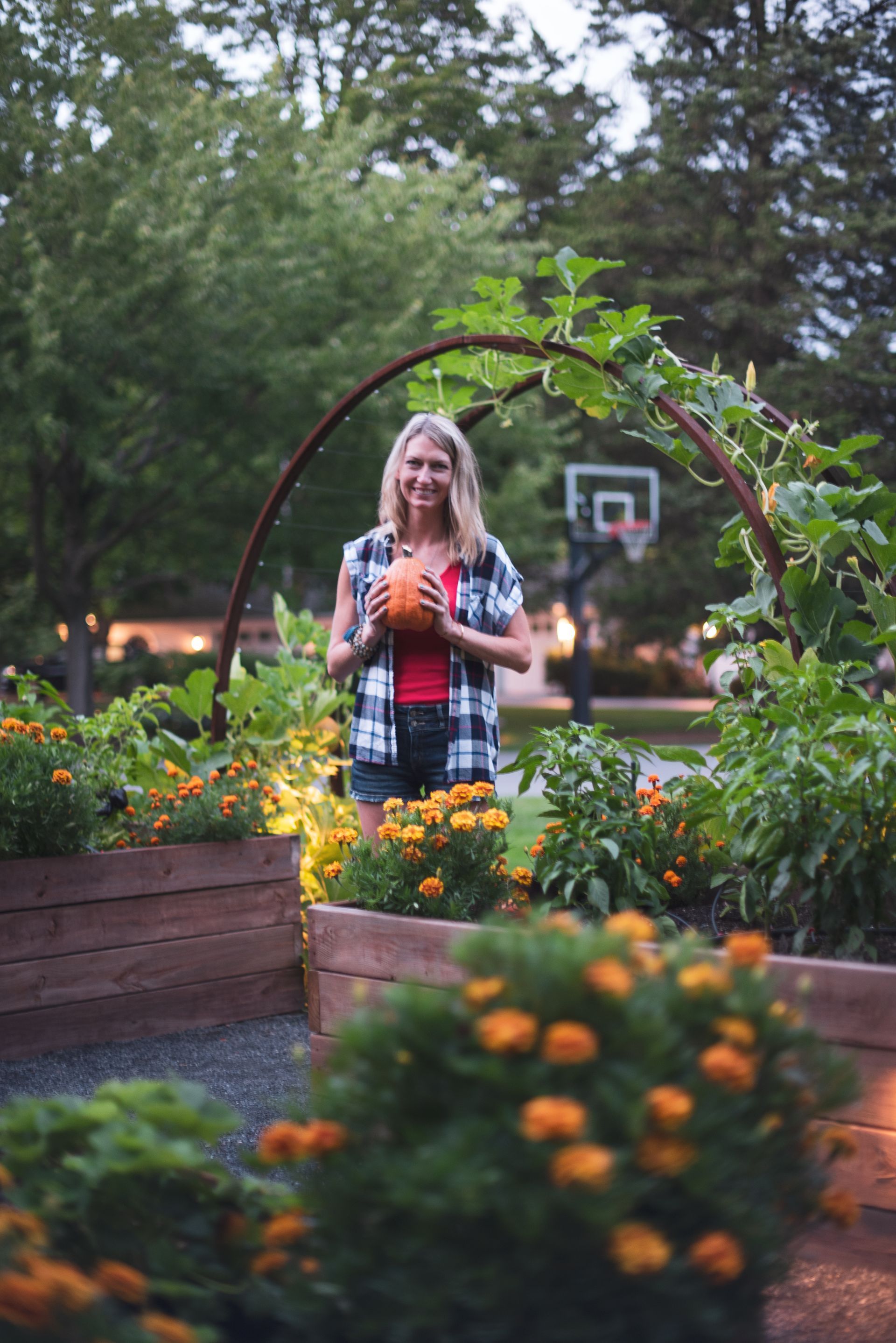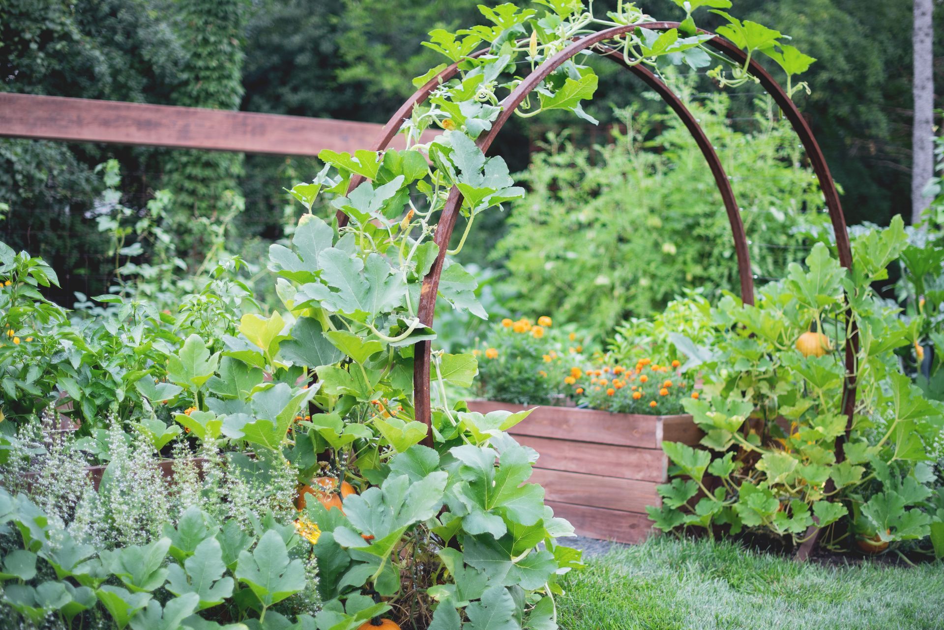 This property features two distinct garden spaces: a smaller kitchen garden designed for herbs and berries centered around a charming fountain, and a larger garden built to support massive vining plants that need room to roam. The larger space—known as the Moongate Garden—gets its name from the arched entryway where pumpkins are grown to cascade over the top. Inside, the decomposed granite path loops around a central steel, stair-stepped planter filled with strawberries, all set agaist the backdrop of a striking 34-foot linear trellis. Together, these gardens create a beautiful, productive landscape that's both functional and full of character!